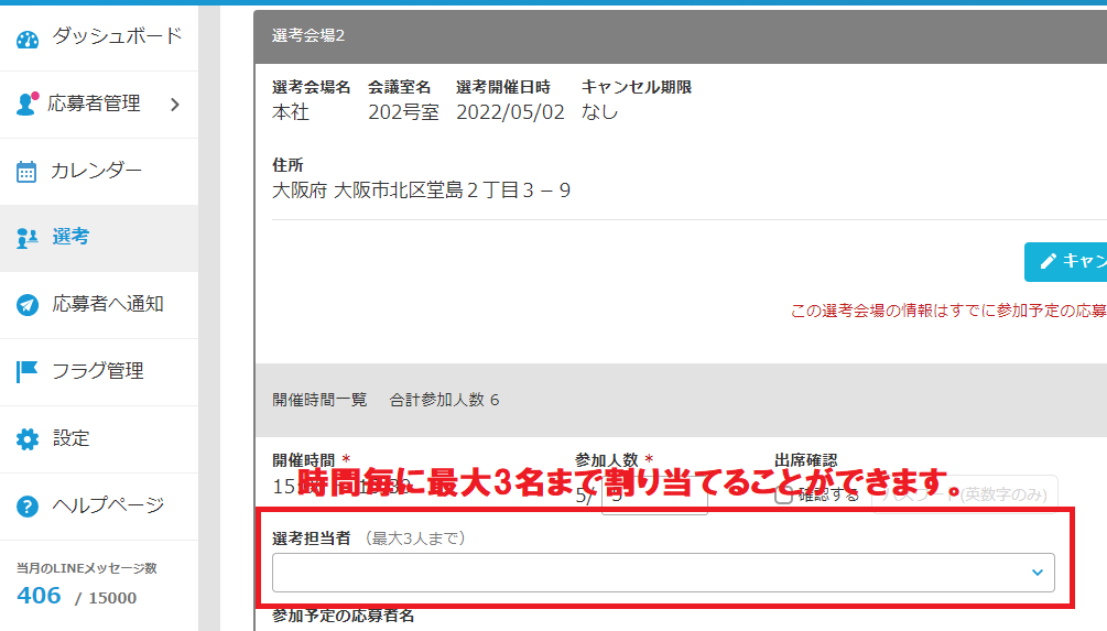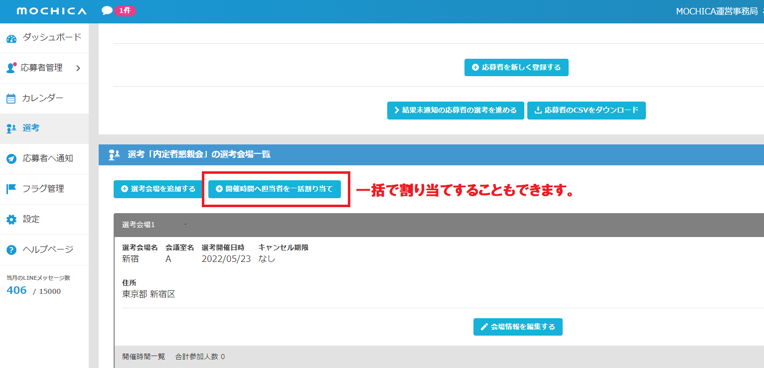 選考に紐づいている時間毎に、担当選考官を割り当てることができます。
