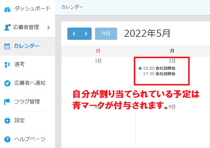 これにより、先日実装された「カレンダー」メニュー内において、自分が割り当てられている選考と、他の人が割り当てられている選考を