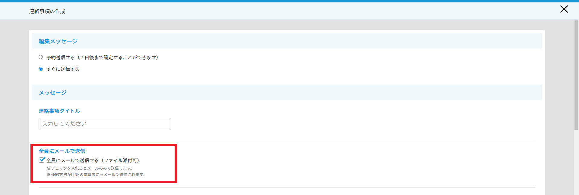 ① 応募者へ通知>連絡事項の作成から「全員にメールで送信する」のチェックマークにチェック