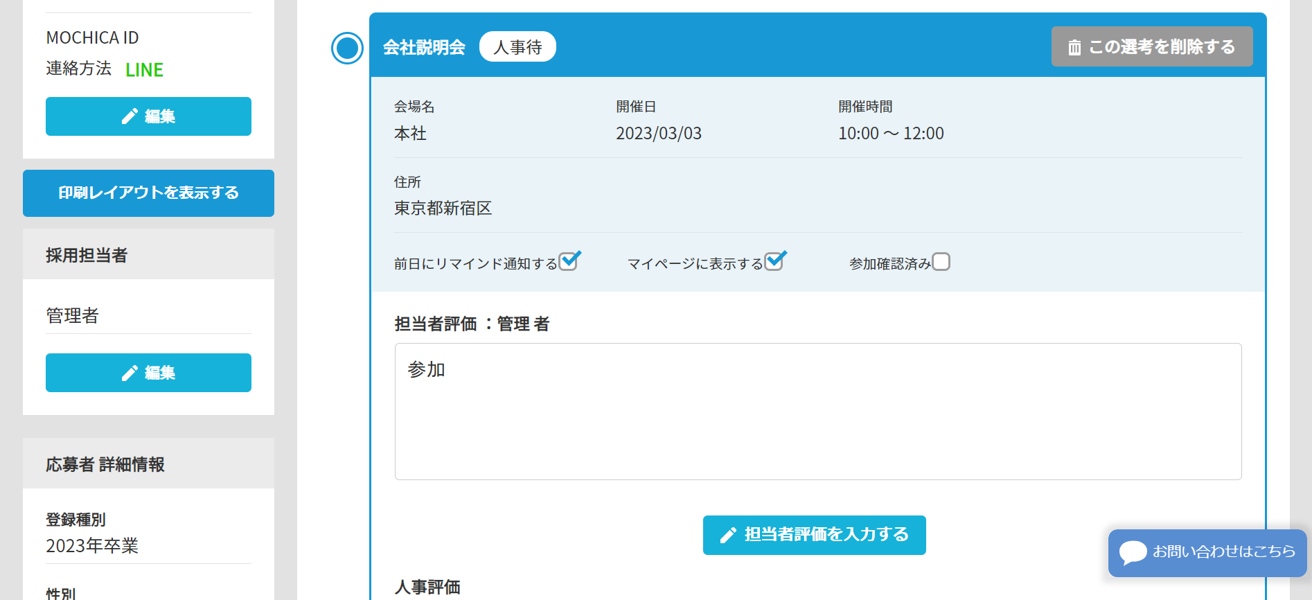 検索項目に連絡方法の追加/担当者評価入力後ポップアップの廃止をいたしました。